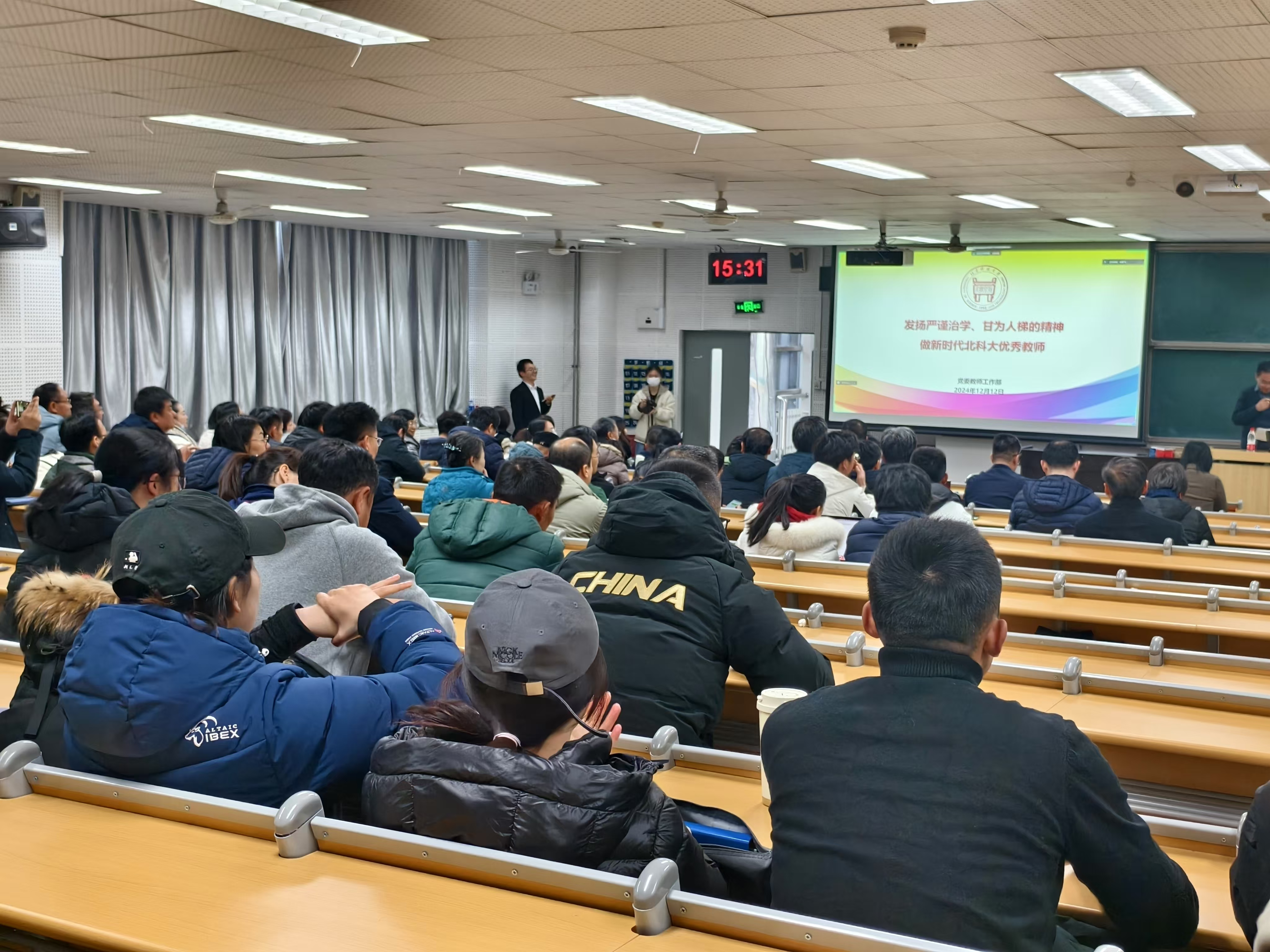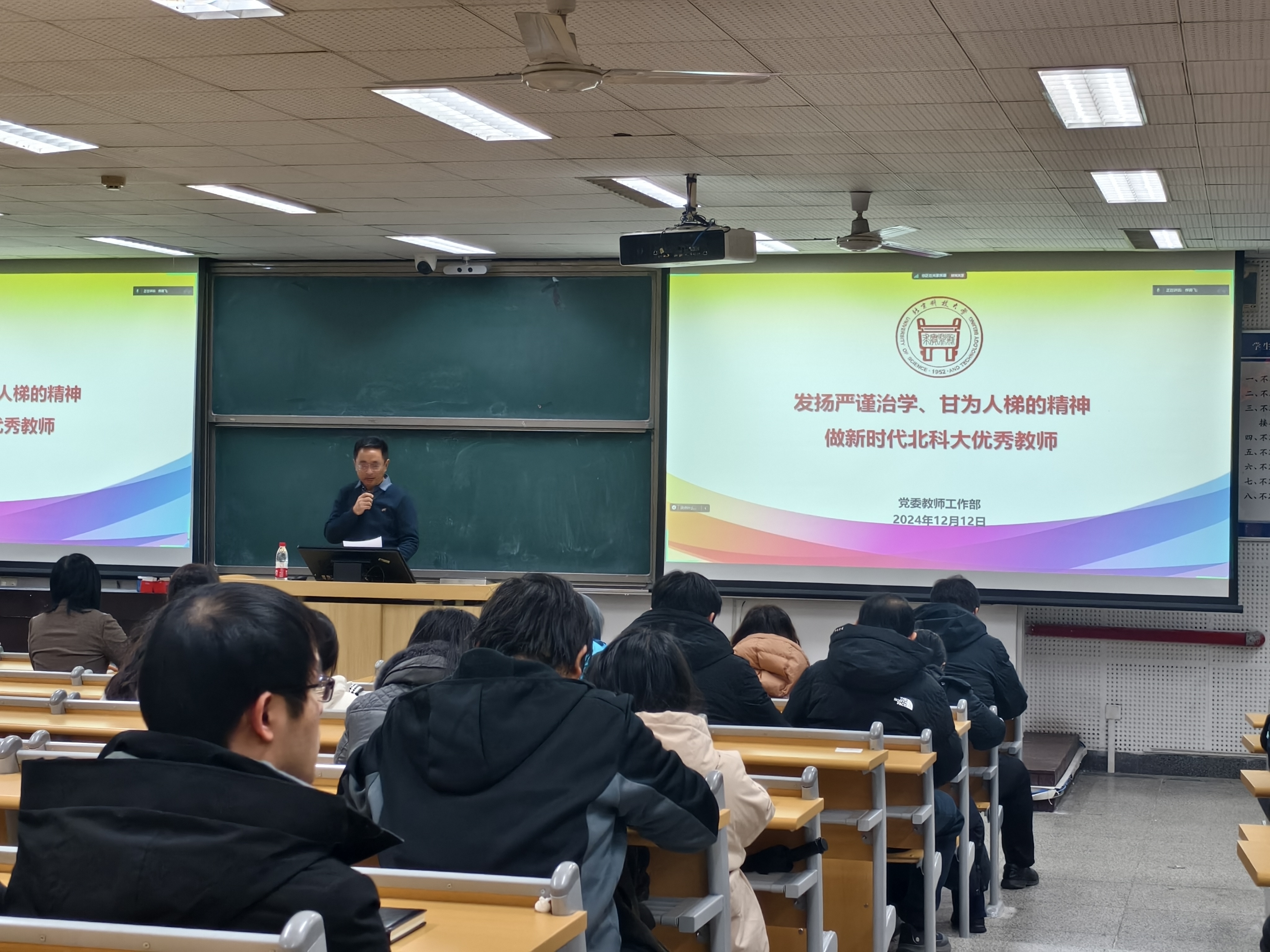 张俊燕部长从中央关于师德师风建设的最新精神、习近平总书记的重要回信精神切入,深入阐述了新时代高校教师职业行为准则及研究生导师指导行为准则,同时分析了违反准则的师德失范案例,并详细介绍了学校师德师风建设工作的体制机制。她鼓励全体教师要以师德先进为榜样,争当师德模范,强化价值引领,严守纪律规矩“底线”,牢守违法乱纪“红线”,弘扬和践行“教育家精神”,争做严谨治学、甘为人梯的新时代北科大好老师,当好“大先生”!